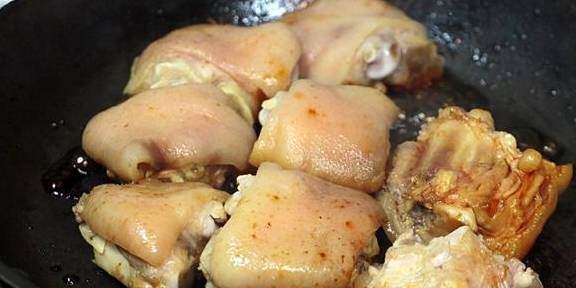 4.把猪蹄倒入不粘锅中,快速翻炒,待上色后加入白酒和老抽,再翻炒一小会,颜色基本ok。