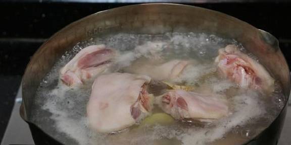 2.猪蹄检查好还有没有猪毛,清洗干净血水,和姜片放进锅里开水煮10分钟,撇去泡沫。捞起用自来水冲洗至常温,沥水备用。(猪蹄块去超市买是最好了,喜欢哪块挑那块,完全没压力)这一步主要作用是去腥,如果可以用冰水快速冲洗飞过水的猪蹄,口感更佳Q弹哟!
