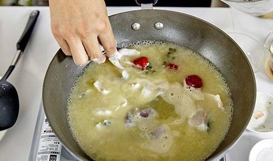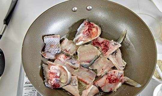 10.热锅放凉油,锅烧热后放入猪油,油温七成热,鱼骨下锅大火煎至鱼骨两面呈金黄色,这样出来的汤才能使奶白色。