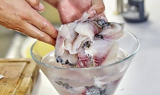 5.片鱼片下刀倾斜45°切,薄厚一致,片好的鱼片放入冷水中浸泡,去除部分血水。