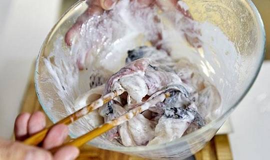 3、鱼片切好后腌制时要用手抓出粘性来。用手抓匀腌制10分钟,然后再加入蛋清和生粉抓匀腌制10分钟,这一步可以去除腥味,也可以使鱼肉更加嫩滑。