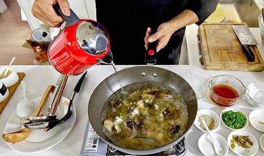 12.加适量开水,进行简单调味,盐一勺半、白糖一勺、鸡精一勺、胡椒粉两勺,再加一大勺白醋调节酸味。