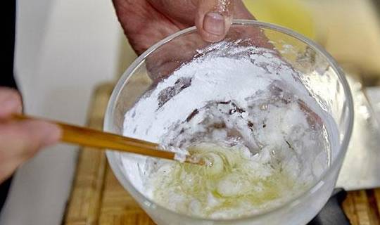 8.空碗中放入鸡蛋清,加入淀粉搅拌均匀。