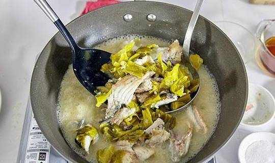 14.捞出鱼骨和酸菜,锅里留汤,这些当垫底。