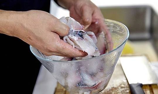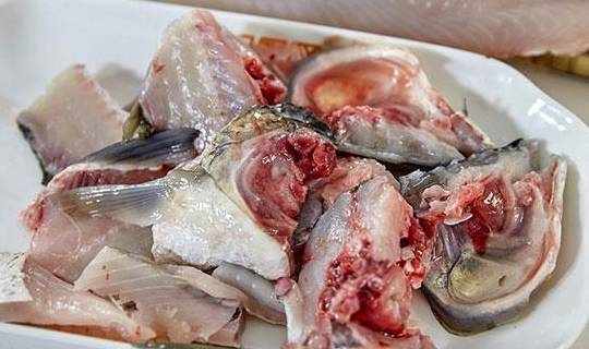 4.将鱼腹刺取下,鱼骨剁块,留下备用(冲净血水)。