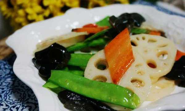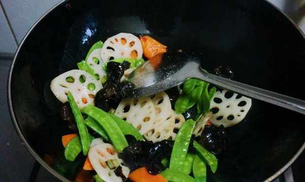 1.事先将黑木耳浸泡在头发里,洗净撕成大块。胡萝卜去皮洗净,切成菱形块。莲藕去皮洗净,切成薄片。将荷兰豆的老筋撕下,洗净备用。大蒜脂肪去皮切片。