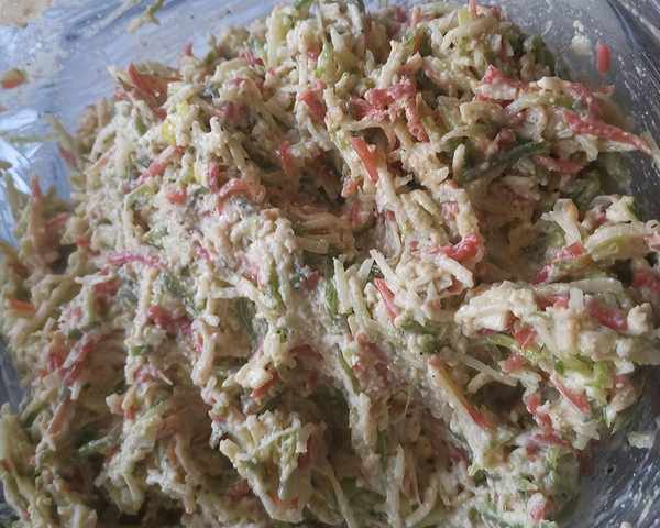 1、将青萝卜、胡萝卜洗净,去皮,用刨丝器磨碎,放入盆中,加盐拌匀腌制20分钟。萝卜丝挤出多余的水分,用刀剁碎,放入碗中。
