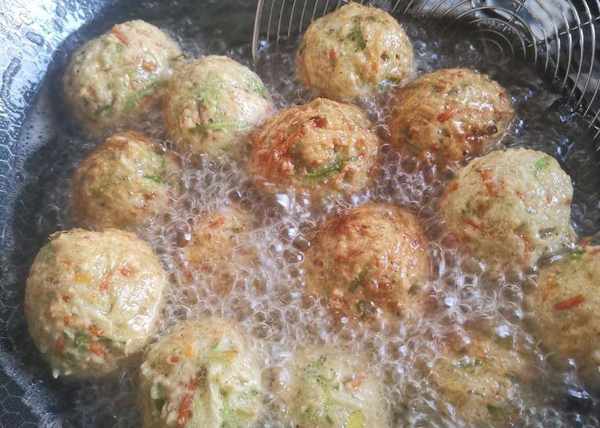 3、锅内倒入适量油,60度热时转小火,将萝卜丝搓成丸子,放入锅中炸至微黄。开大火提高油温,然后放入丸子炸至焦黄,捞出沥干油,外脆内嫩的萝卜丸子就做好了。