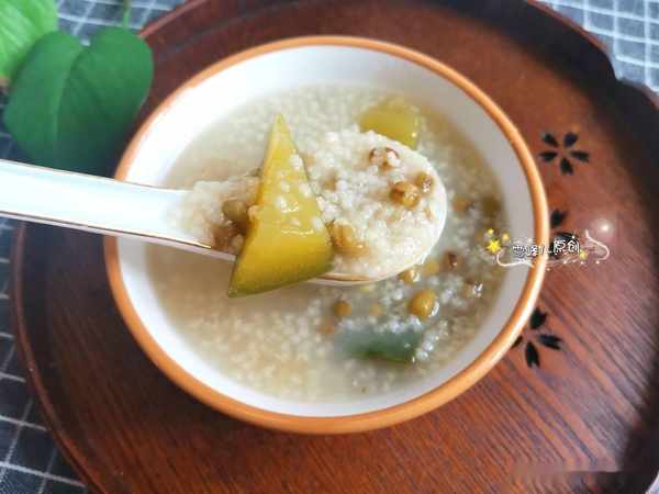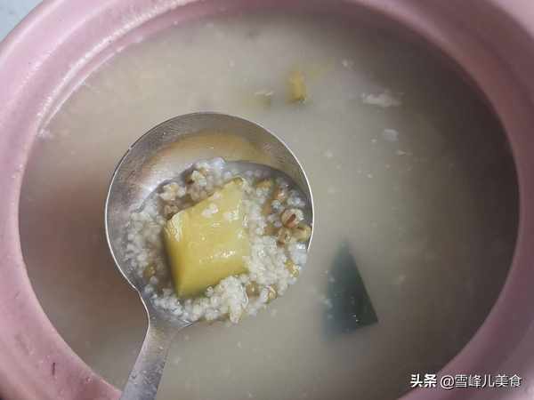 第四步:把砂鍋放入清水,加入綠豆燒開,然後加入小米和南瓜,改成小火慢慢熬煮20分鐘。