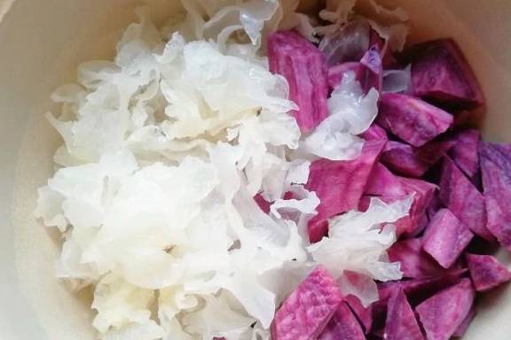 3、准备一个砂锅,将准备好的银耳和紫薯放入锅中,加入适量的清水备用。