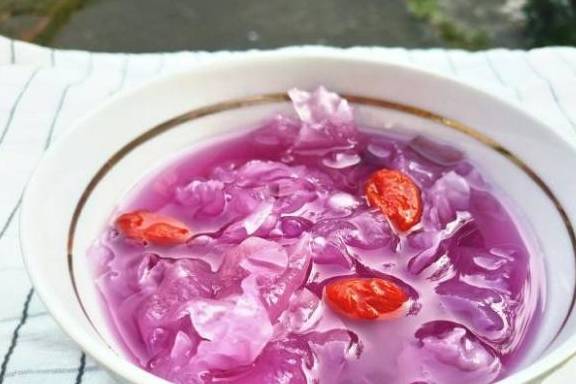 4、将砂锅放在火上,开大火烧开,然后加入准备好的冰糖,开小火继续熬制40分钟左右,将汤汁熬制浓稠,银耳熬制出胶即可,然后放入准备好的枸杞,继续用小火熬制5分钟,关火出锅即可食用,一道暖暖的,甜甜的紫薯银耳汤就做好了,很适合冬天喝。