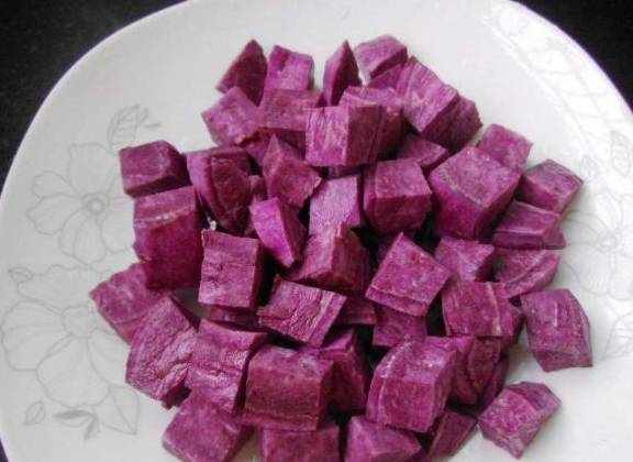 2、紫薯用清水洗干净,用削皮刀将紫薯皮削掉,然后清洗一遍,用刀将紫薯切成小块备用。