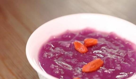 食材:干银耳15克、紫薯300克、冰糖10克、枸杞适量、水适量。