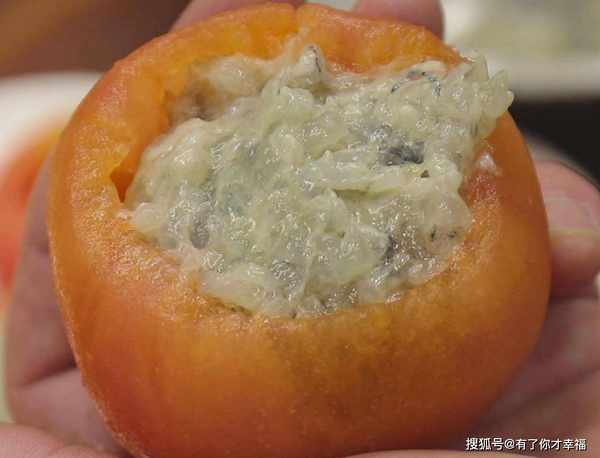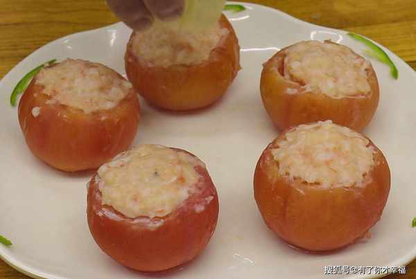 5、然后把打好的虾蓉装进番茄盅里面,并轻轻按压,把虾滑压紧实,全部填好以后准备上锅蒸。