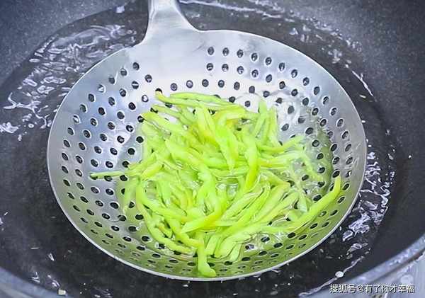 4、烧半锅开水,把青椒丝放进去稍微烫一下,生青椒吃着有股辛辣味,三五秒钟就可以了,捞出来备用。