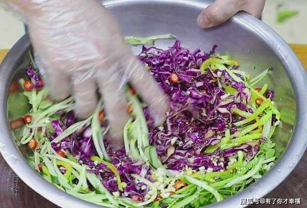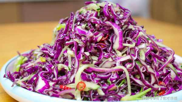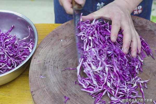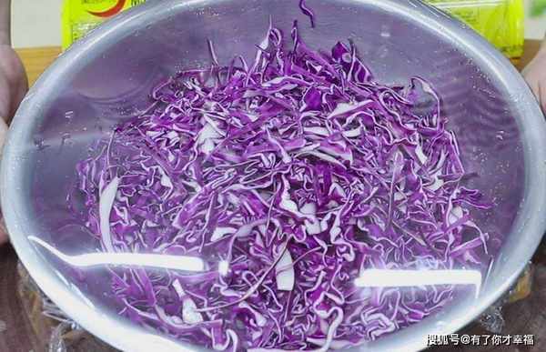 1、紫甘蓝用半个就够了,剔除中间的硬根,切成细丝,尽量细一点,拌的时候好入味。然后把切好的紫甘蓝多冲洗几遍,充分去除表面的浮色,这样拌出来既不会发黑,口感也更加清脆,洗干净以后控干水分放入盆中。