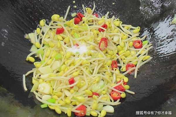 4、锅内烧油,倒入葱姜蒜和小米椒快速翻炒,翻炒出香味以后倒入黄豆芽快速翻炒,翻炒一分钟左右,我们开始调味。