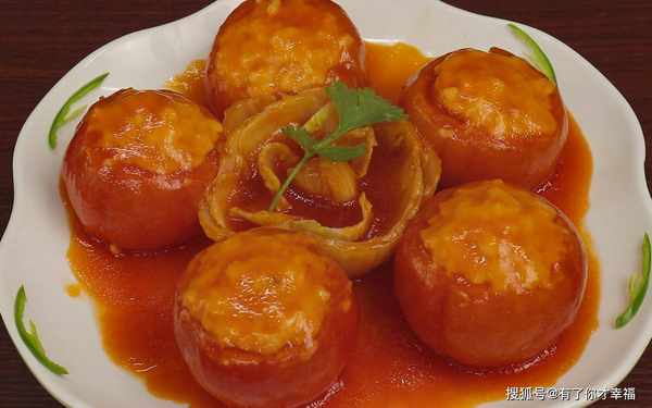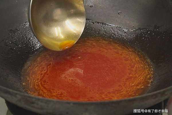 7、先别急着吃,还得浇个汁儿,锅内烧油,放入适量的番茄酱,加入一勺清水,把番茄酱搅化,再放入少许白糖和食盐增加底味,转大火烧开,淋入一点水淀粉增加浓度,少许明油提亮色泽,搅匀以后起锅。把料汁均匀浇在番茄盅上面,美味即成。