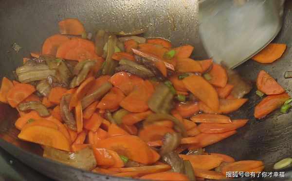 3、调好味倒入胡萝卜,这个时候转中小火慢慢炒,胡萝卜本身有发甜的后味儿,很多人不喜欢,小火慢炒能让胡萝卜把猪油吃进去,成菜更香,还不会发甜。