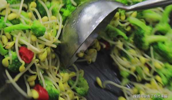 1、黄豆芽300克用清水浸泡,捡出豆皮不要,西兰花切成一个一个的小朵,炒的时候可以节省烹饪时间,切好以后放在盆中加水浸泡,加入食盐2克,可以有效减少农药的残留。