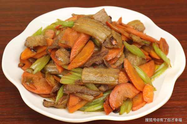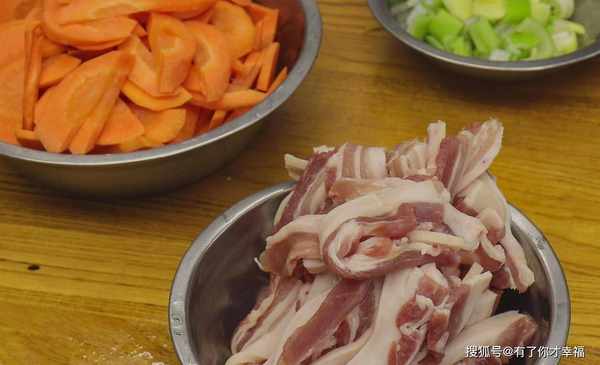 1、胡萝卜要多准备几个,削去外皮后洗干净,切成片,当然切丝也可以,准备一块带皮五花肉,切成薄片,再切一点芹菜段用来搭配颜色。芹菜斜刀切,或者拍后再切都可以,方便入味。