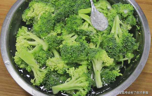 3、把西兰花焯一下水,锅内烧水,加入食盐2克,加入食盐防止维生素的流失,并且也能使西兰花色泽翠绿,将西兰花焯至八成熟倒出备用。