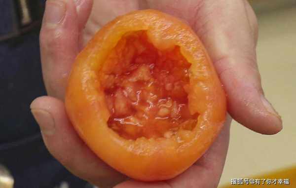 2、然后把番茄蒂那一边切平,挖出里面的番茄瓤,做成番茄盅,这一步千万不要把外壁挖破。