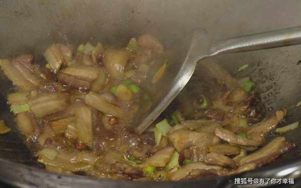 2、食材准备好以后开始烹饪。先烧油滑锅,滑好锅以后倒出热油,加入凉油,放入五花肉煸炒出里面的肥油,这样成菜更香,闻到肉香味以后放入两粒八角,继续把肉片煸炒至干香,放入葱姜翻炒几下,沿锅边淋入料酒、生抽。