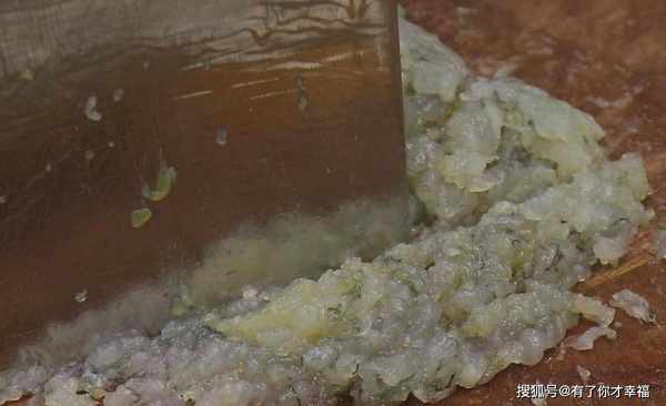 3、把冻好的大虾取出来,掰掉虾头,扣去虾壳,取出里面的虾仁,全部处理好以后,用刀背把虾仁剁成虾蓉,如果用的是淡水虾,最好去一下虾线。用刀背剁的好处是接触面积大,容易剁碎速度快。把虾蓉剁至发黏、弹滑,稍微又一点点小颗粒,吃起来鲜又弹还滑润。