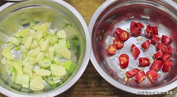 2、小米椒切成辣椒圈放在盆中,大葱白一小段破开切成葱花,生姜一小块切成姜片,大蒜几粒切成薄片。