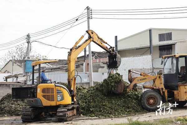 2月3日下午,两辆铲车出现在仓库门口,工作人员操作挖掘机将地上的芥菜搬运到仓库。 南方日报、南方+ 吴明 拍摄
