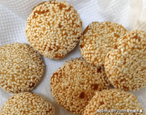 2、把面团搓成长条,切成小块。把小块面团搓成圆球,压扁后两面粘上白芝麻。平底锅倒油烧热,放入红薯糯米饼,小火煎至两面金黄即可出锅。