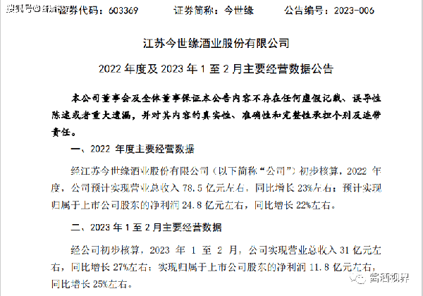 3月12日,今世缘发布2022年度及2023年1至2月主要经营数据公告。 2022年度,公司预计实现营业总收入78.5亿元左右,同比增长23%左右。 2023年1-2月,公司实现营业总收入31亿元左右,同比增长27%左右; 净利润11.8亿元左右,同比增长25%左右。 此前,今世缘2023年工作大会上,今世缘党委书记、董事长顾祥悦曾动员今世缘上下,瞄准百亿目标乘势而上,誓夺首季开门红,誓拼营收百亿。 此份“双位数、双增长”的1-2月份成绩单公布,预示今世缘首季“开门红”已经提前在握。