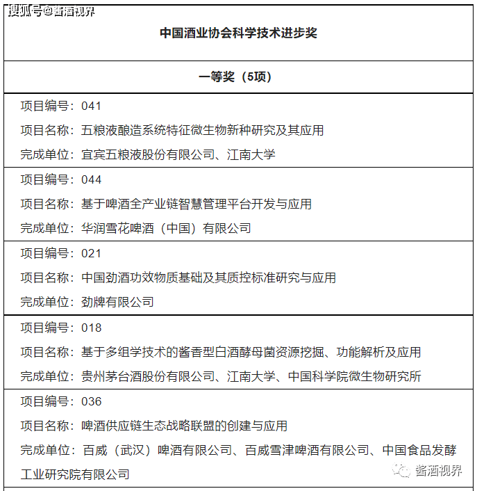 3月13日,中国酒业协会公示2022年度“中国酒业协会科学技术奖”评审结果。 2月17日,中酒协组织有关专家针对项目类材料召开了“2022年度中国酒业协会科学技术奖项目评审会”,经评审委员会审议,从通过型式审查的44个申报项目中推荐“五粮液酿造系统特征微生物新种研究及其应用”等5个项目为科学技术进步奖一等奖,推荐“大曲微生物群落功能强化关键技术与应用”等6个项目为科学技术进步奖二等奖,推荐“大罐浓醪发酵酒精生产技术及装置”等11个项目为科学技术进步奖三等奖。