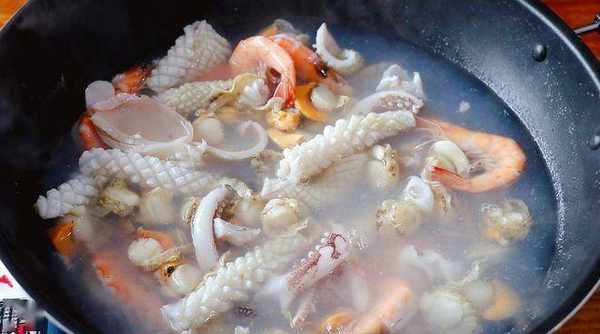 1、 把海鲜们提前处理干净,放入锅中焯一下水,捞出沥干。