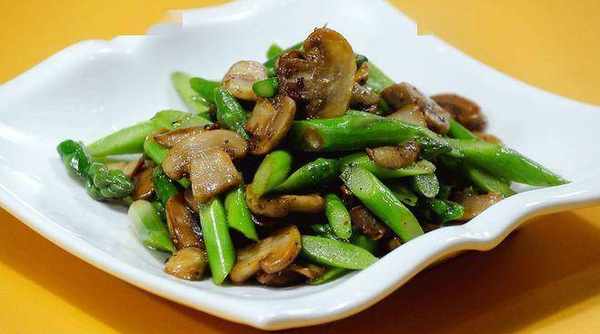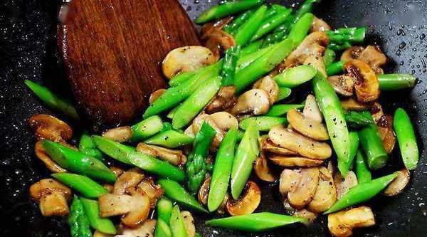 4、 另起锅,倒入适量的油,把口蘑倒进去煎一下,等表面变黄后倒入芦笋一起翻炒。