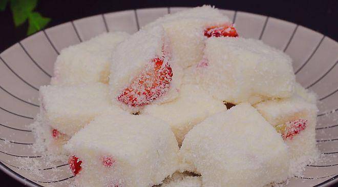 3、 碗中铺上些许椰蓉,把熬煮好奶糕倒进碗中,上面铺一层草莓,继续倒入奶糕,最上方再铺一层椰蓉,用保鲜膜盖好放入冰箱冷藏。