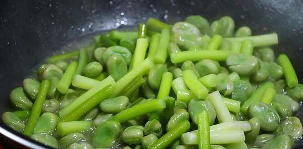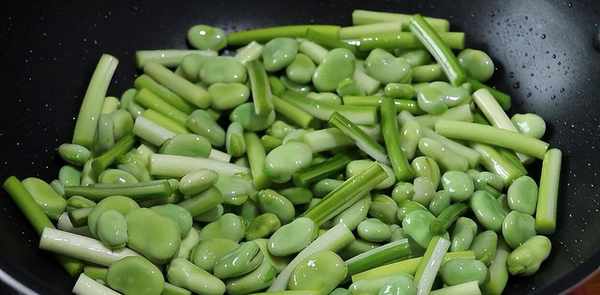 3、 锅中加入适量的油,油热将蒜苗和蚕豆一起放入锅中,将两者炒至半透明状;