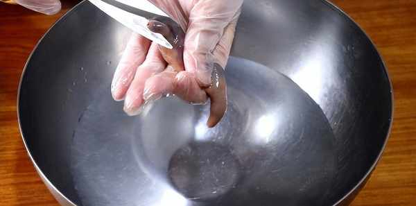 1、 用剪刀剪去海肠两端,挤出脏东西,然后翻过来清洗干净,海肠要多洗几遍这样才洗的干净;