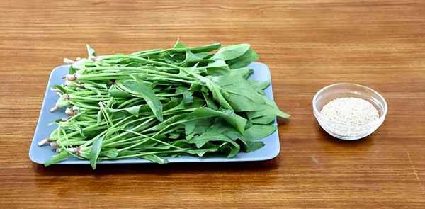 准备食材:菠菜、熟白芝麻、芝麻油、盐