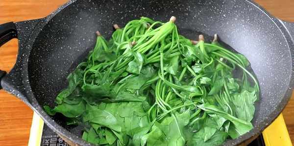 2、 往锅里加适量的水烧开,把菠菜放进去焯一下水,变软之后,把菠菜捞出来,放在凉水里面过一下;