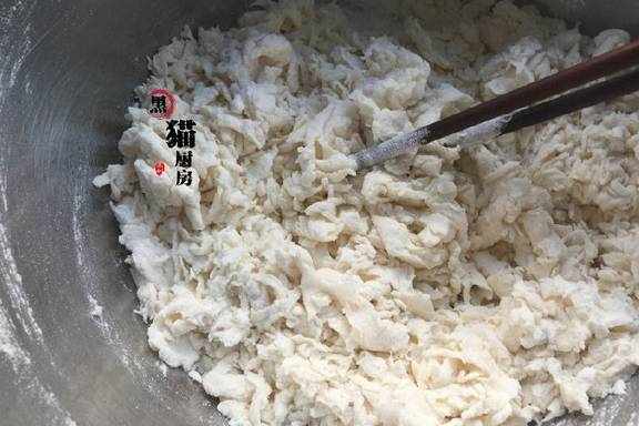 做馅饼首先得会和面,面团要有70度左右的温热水,倒入面盆里,边倒边用筷子把面粉都拌成絮状(看下图),直至所有的面粉都拌匀,有朋友说不会掌握水份和面粉的比例,因为不同品牌的面粉筋度都不一样,所以小编没有称量固定的热水克数,全凭一双筷子。加水的时候不要心急,搅拌至下图这样没有其他零散的面粉了,就可以拿开筷子,用手把它们都揉成团了。