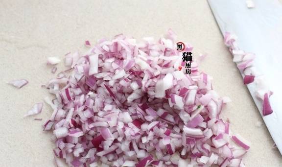 3.准备半个洋葱,切碎。切洋葱不流泪的小窍门,就是切之前,先把洋葱放入冰箱冷藏一会,大概15分钟,然后再切,这样切洋葱可以减少辣味哟。