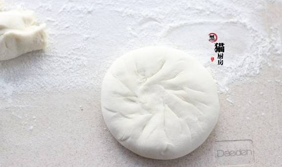 6.取一个小面团,按压揉圆后用擀面杖擀开成巴掌大小的面皮,包入适量调好的肉馅儿。