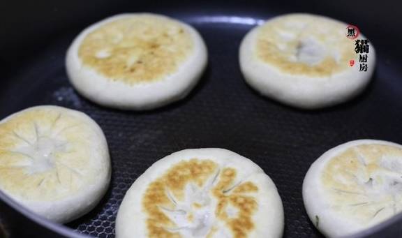 8.平底不粘锅加热后,倒入少许油,把包好的馅饼放入锅内,使每个馅饼都均匀的沾上一些油,小火盖上盖子烙至两面微微金黄。