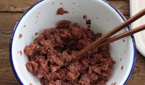2.市场买的牛肉,自己在家剁碎,自己手剁的还是比机器搅碎的口感好。然后磕入一个鸡蛋清,加入适量盐和油,筷子顺着一个方向把肉馅拌上劲儿。用不了几分钟,你会发现肉馅很容易就上劲儿了,因为加了鸡蛋清,能更好的保留肉质的水份,使整个肉馅的肉质更爽滑多汁,可别少放了鸡蛋清哟。