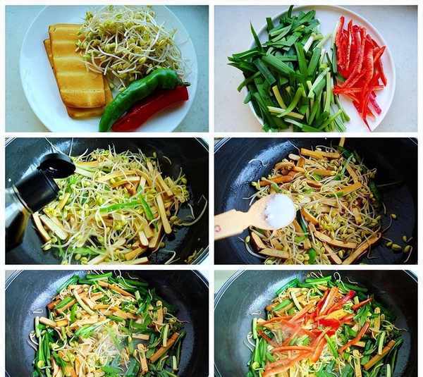 主料:香干两块、黄豆芽200克、韭菜150克