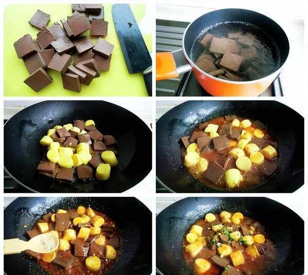 做法:1、把鸭血切块,在开水里烫变色捞起