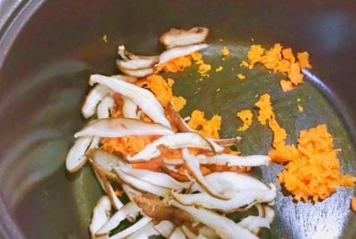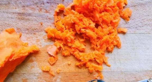 这个汤,除了豆腐重要呢,还有就是我们另外一个主角。胡萝卜,要把胡萝卜洗干净,然后刮皮,要刮干净哦,不然皮会影响口感,然后用勺子把胡萝卜刮成絮状,这个做法是为了能让变成金黄色的关键一步哦,而且这样吃胡萝卜非常鲜!