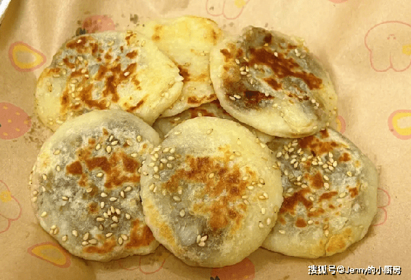 接着给每个小饼上刷层水,再撒点芝麻。最后平底锅刷油,放入小饼,小火烙到两面焦黄,就可以出锅了。